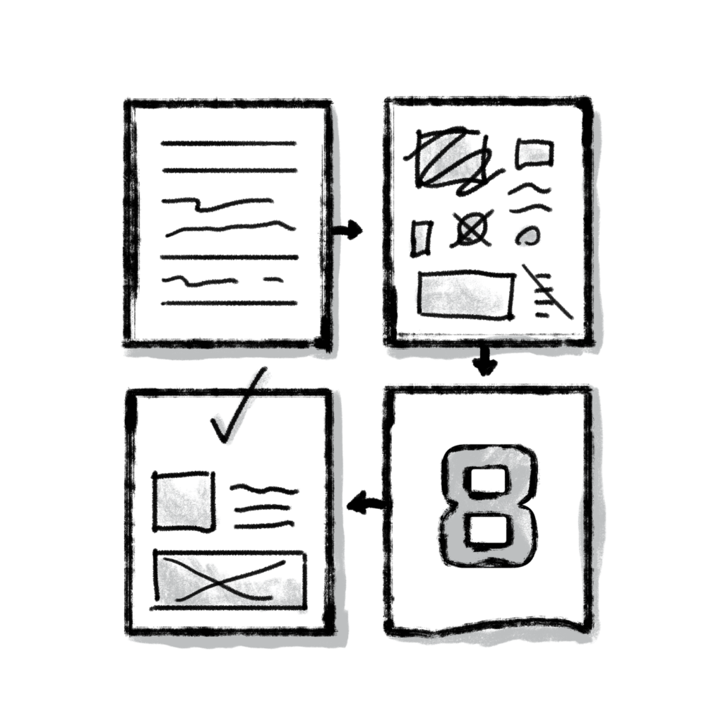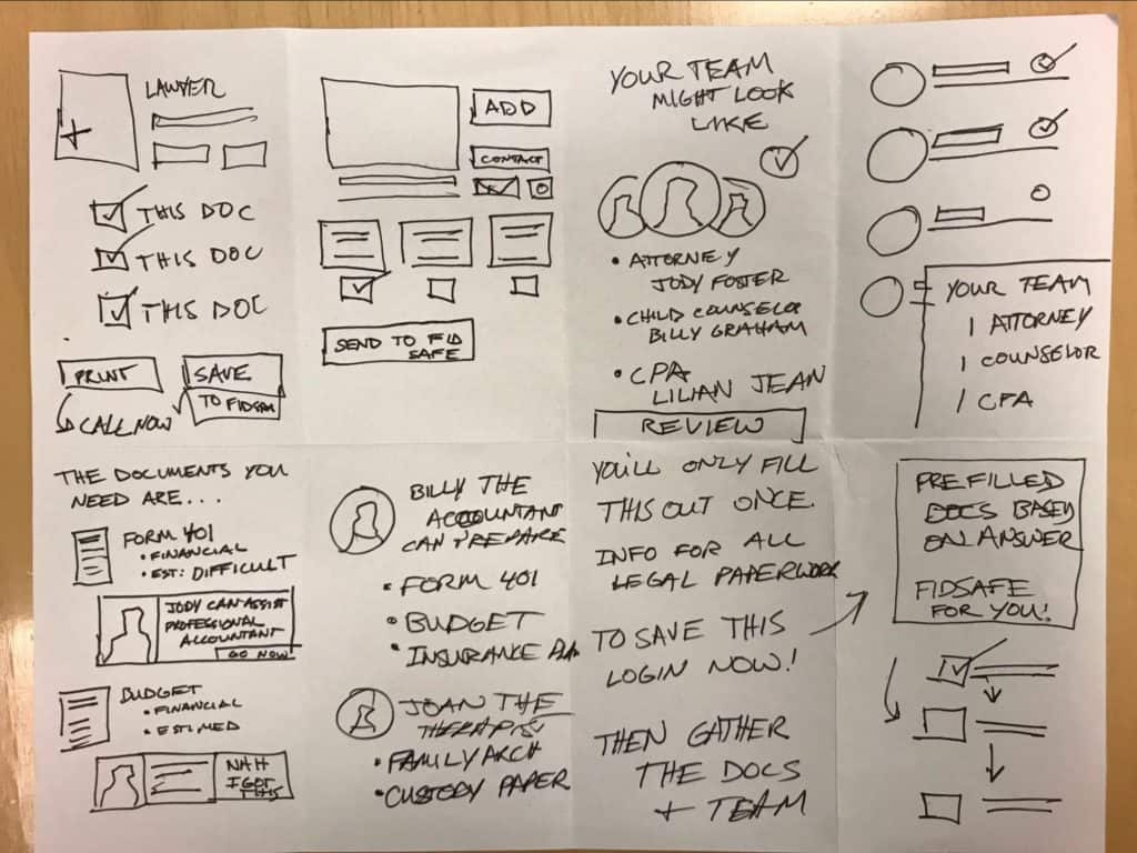 During the Crazy 8s exercise, we gave everyone on the team eight minutes to explore eight new ideas quickly. We instructed them to fold a paper in half three times, so they had eight squares to sketch in. We then allocated 1 minute per square for participants to unlock latent ideas and try different versions of an idea.