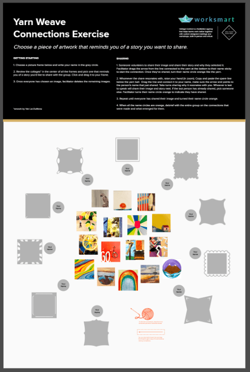 In talking to Van about her intriguing Yarn Weave activity, we discovered that it was essential to create a similar experience for the virtual landscape to offer remote teams the opportunity to grow deep connections. So we collaborated and came up with a virtual adaption in MURAL–a virtual whiteboard tool that allows distributed teams to work together in real-time, visually. The Yarn Weave Connections Exercise template captures the essence of the in-person activity and makes it accessible for anyone anywhere to implement. Instead of standing in a circle with other participants, each person places their name in a circle of picture frames that surround different images in the center of the board. The activity operates the same as in-person, as a volunteer starts, shares, and another volunteer reacts to a personal connection they feel. Instead of passing around a ball of yarn, participants are connected by dragging an arrow, connected to an image of a ball of yarn. The end result is a powerful visual and metaphysical connection among all participants.